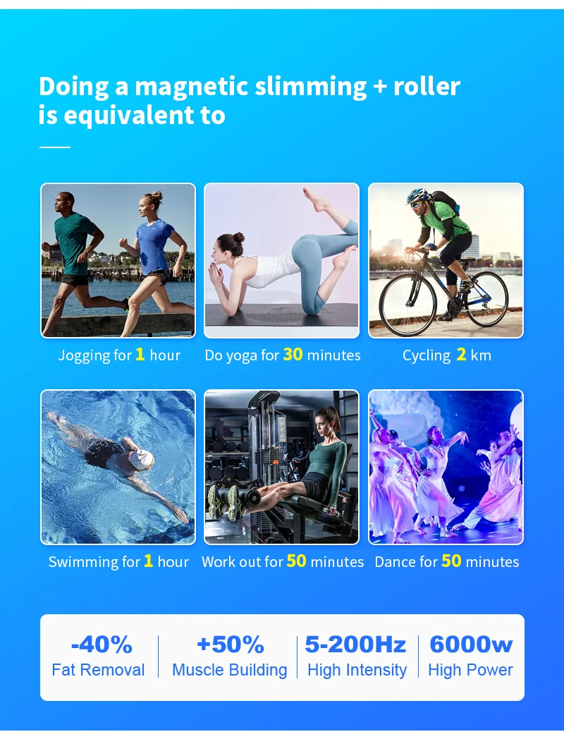 The roller massager mainly stimulates the skinand muscles of the human body through themovement of the roller, promotes blood circulationand metabolism, and thus achieves the effect ofweight loss The handle adopts The Hl-EMT technology achieves 100% maximummuscle contraction, which can trigger a largeamount of fat breakdown. Fatty acids are brokendown from triglycerides and accumulate inadipocytes.Excessive fatty acids can lead to thedeath of fat cells and be excreted from the body bynormal metabolism within a few weeks ①.30minutes of treatment =30,000muscle exercises. Fat Breakdown In less than 4 minutes the temperature in fat reaches levels that cause their permanent damage. Muscle Warm-Up The muscle temperature raises by several degrees, similarto what a warm-up activity does beforeany workout. Supramaximal Contraction Muscles in the treated area are contracted at intensities that are not achievable during routine exercise. After Treatment The fat cells are slowly removed from the body and the strained muscle fibers initiate a growth process. This results in fat elimination and muscle building. TREATMENT THE rectus abdominis separation brings non-invasive technology to postpartum women and solves the problem of rectus MUSCLE SCULPT Exercising the abdominal muscles, shaping the vest line / exercising the hip muscles, creating the peach hips / exercising the abdominal oblique muscles, and shaping the mermaid line. REDUCE FAT Contraction of muscle needs a large amount of energy supply, so the fat cells beside the muscle are also consumed, leading to natural apoptosis and effective reduction of fat thickness. BUILD MUSCLE The muscle contracts 35, 000 times with high frequency and intensity, so aslo train and increase muscle density and volume.