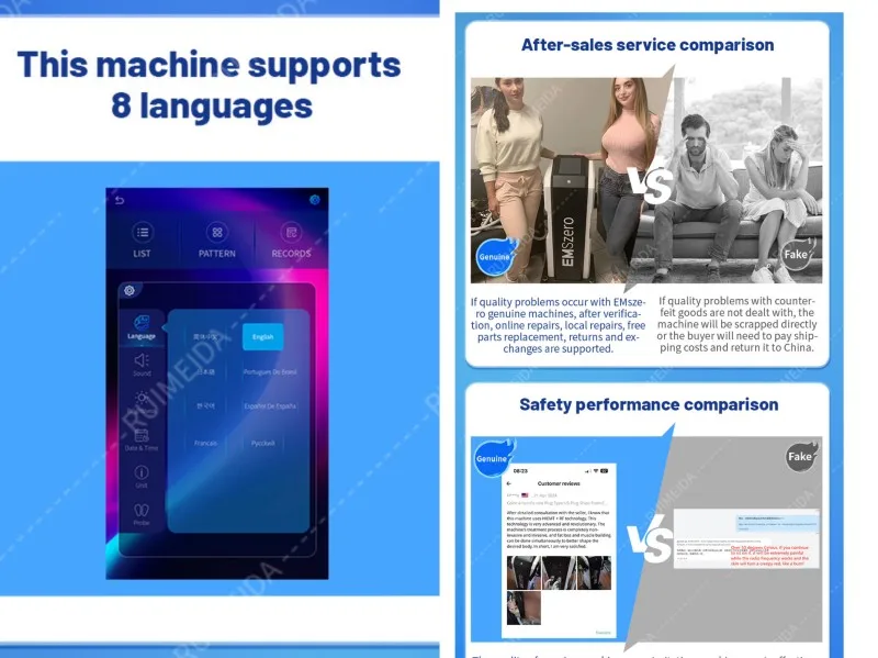 Dear, this is the latest muscle exercise machineOriginal HIEMTeffect and quality is very good, welcome to consult me Instructions for placing orders This machine can provide different socket types and standard voltage. Please note the type you need when you place the order. In addition, our machine can provide special customized services, such as changing system language, adding logo, different color chassis, adding replaceable handle, etc. for details, please consult the seller, thank you for coming! The company guarantees all equipment for 1 year