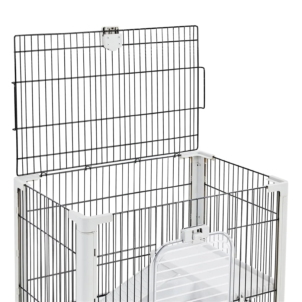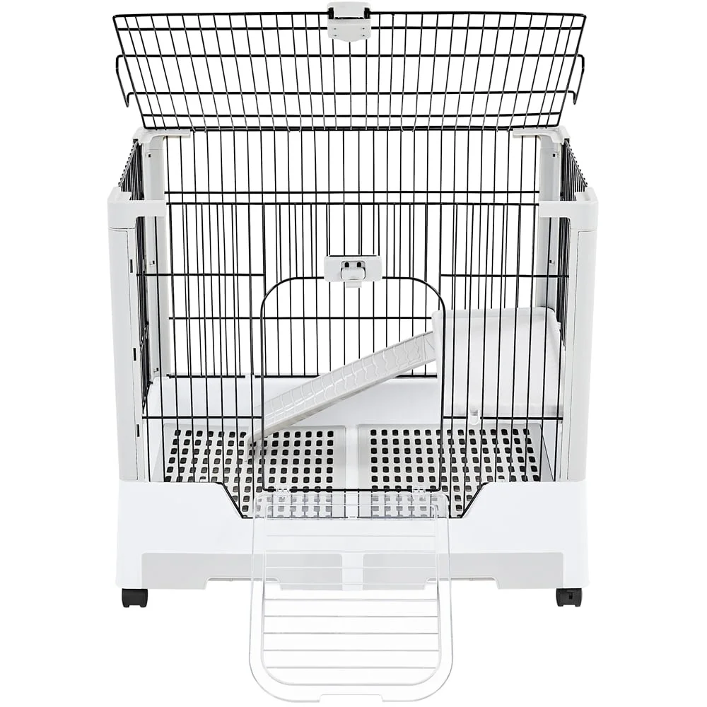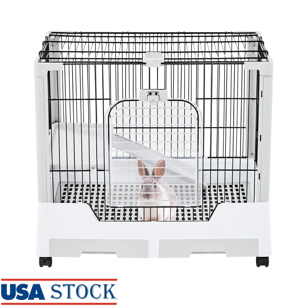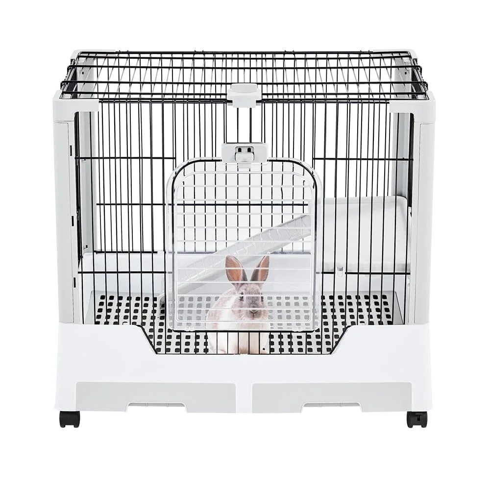 Check out the two-level Rolling Rabbit Cage! The 3/4" bar spacing is ideal for small animals such as bunnies, guinea pigs, ferrets, and chinchillas. This rolling rabbit cage is comprised of powder-coated metal wires and PP plastic, ensuring years of enjoyment. Better yet, this cage is really easy to clean! The two grid panels keep the interior cage tidy, and the pull-out litter trays make cleaning simple. You can easily move about the cage thanks to the four 360-degree swivel wheels (two of which are lockable). Most importantly, this rabbit cage features a large top hole for simple cleaning and decoration. Assembly is easy and fast.