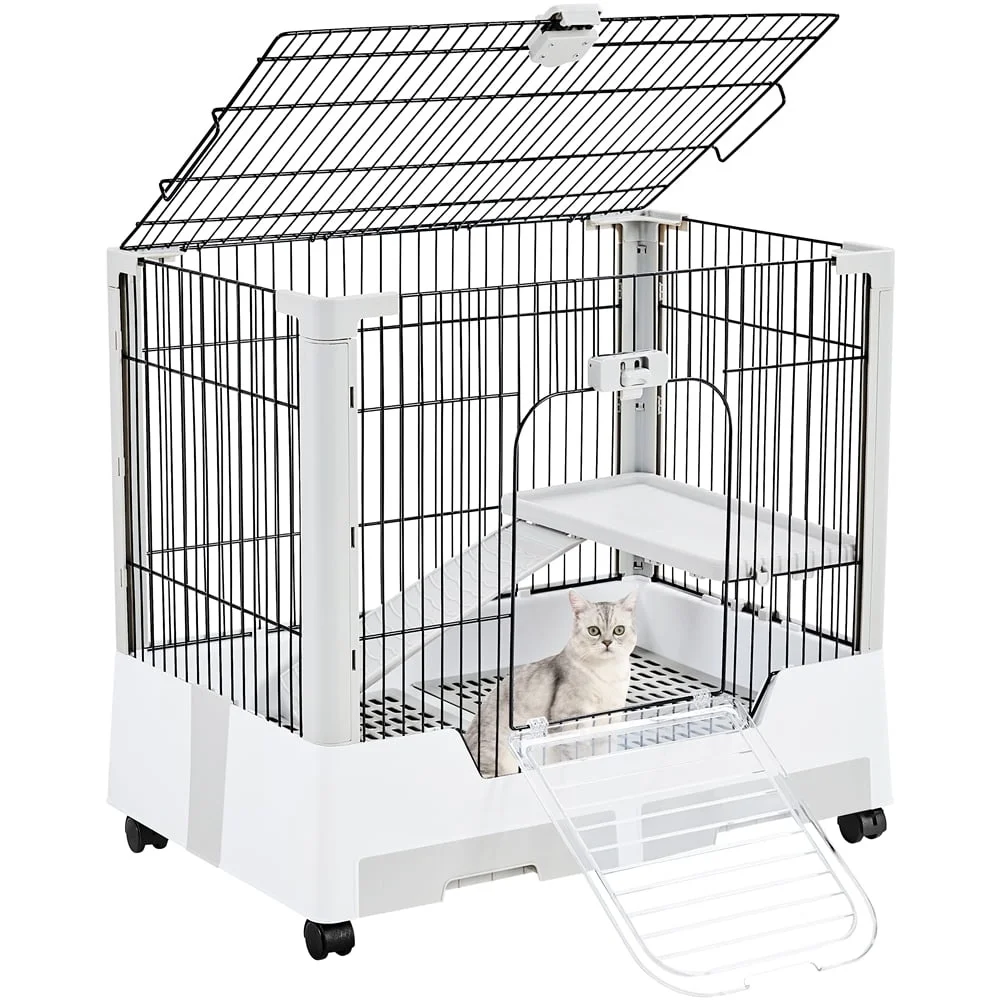 Two Level Rolling Rabbit Cage Small Animal Habitat with Ramp and Platform Easy Clean Swivel Wheels Indoor Use